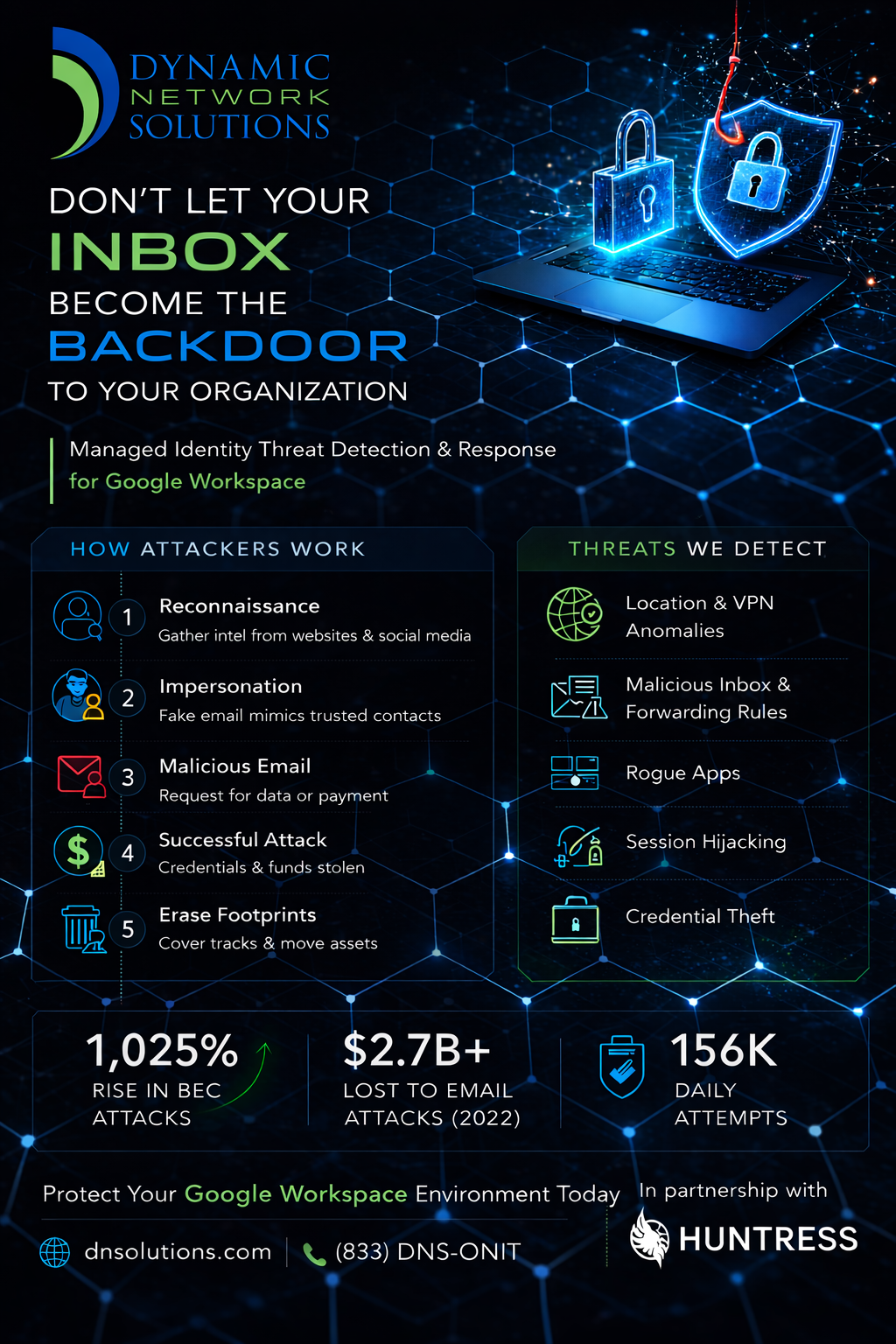 Dynamic Network Solutions delivers continuous monitoring and rapid response to identity-based threats targeting your organization. Our managed service integrates seamlessly with your existing Google Workspace infrastructure to detect credential theft, session hijacking, and unauthorized access without disrupting your daily operations.